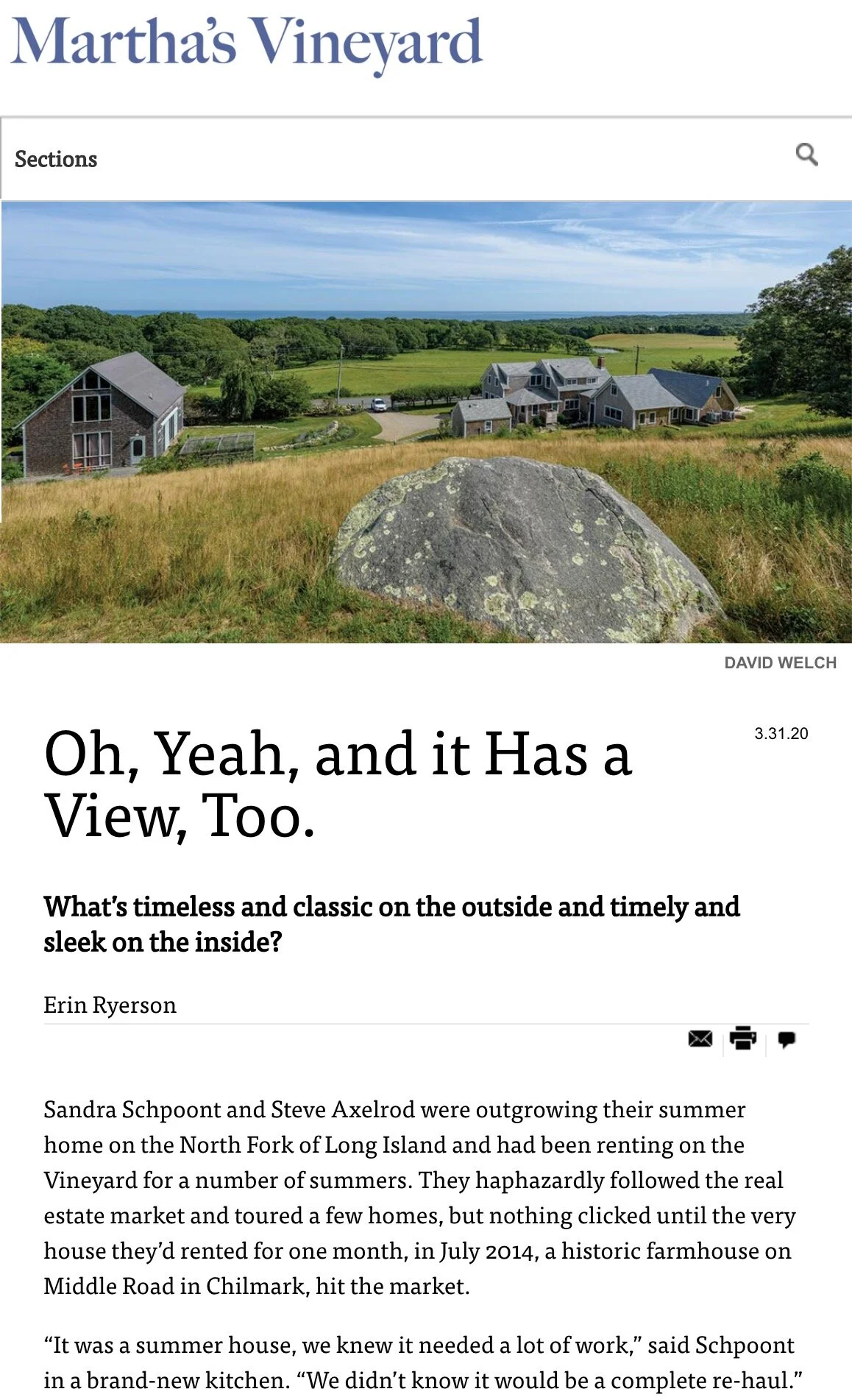 Martha's Vineyard Magazine: Oh, Yeah, and it Has a View, Too. Project: Martha’s Vineyard Farmhouse / link to article Thomas RichterMarch 17, 2020B 0 Likes